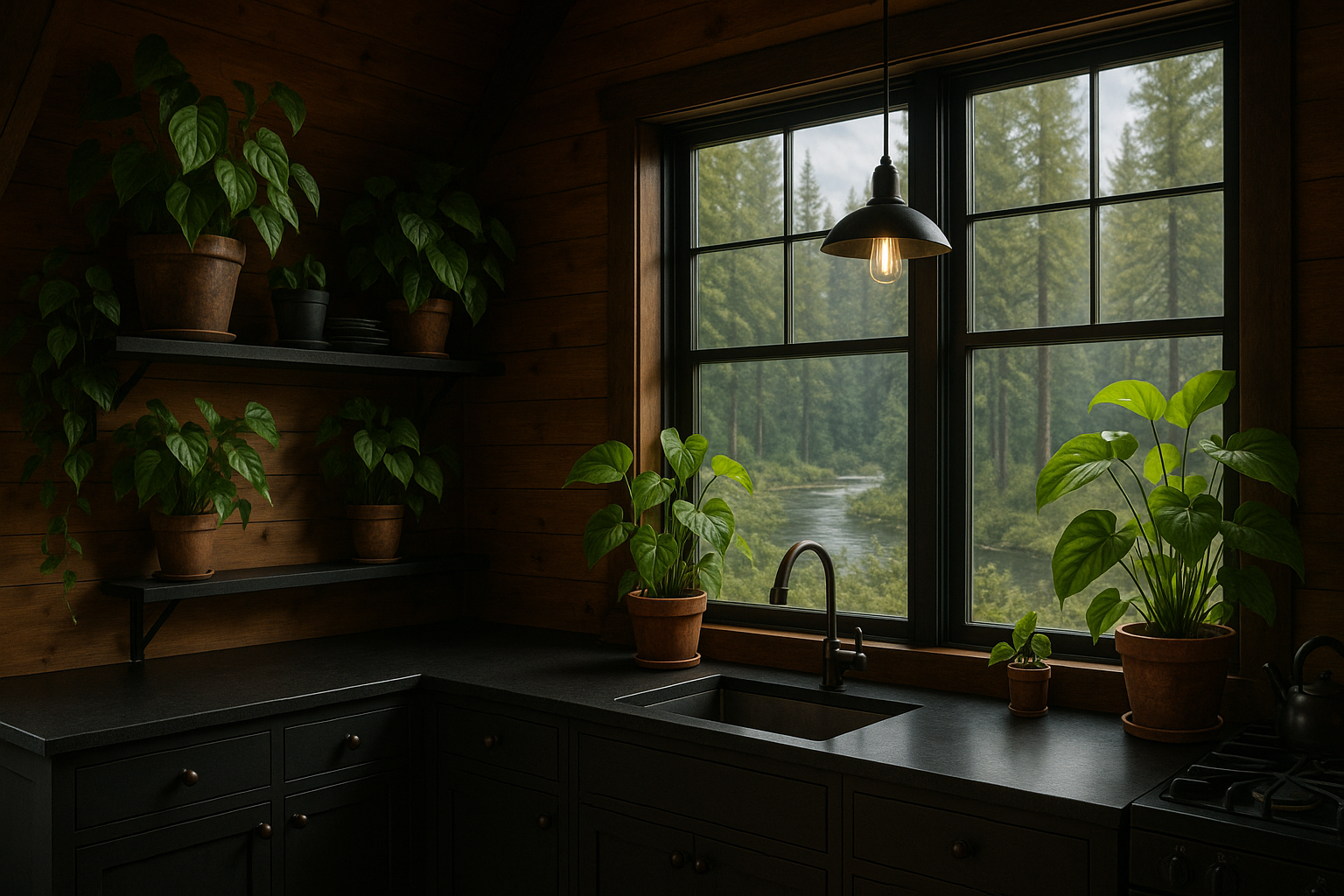 The kitchen was filled with vibrant pothos plants, and the aesthetic was cozy, warm, black, and woodsy. The natural light streaming through our new windows? Divine.